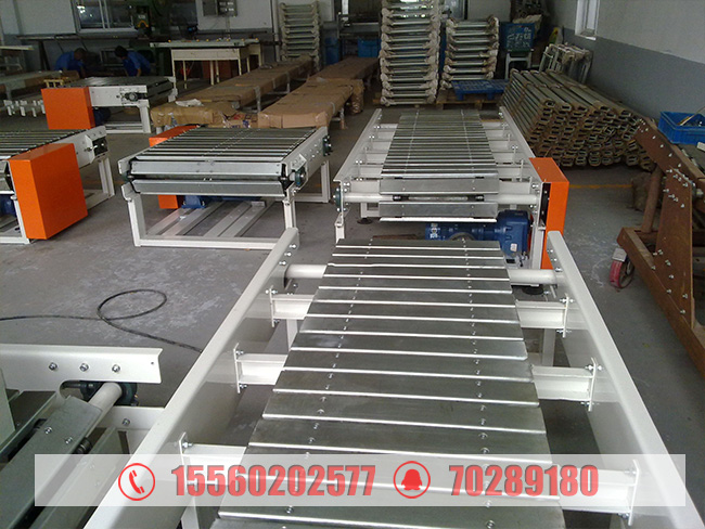 Plate chain conveyor is suitable for the irregular shape goods overload transportation.Chain choose hollow roller chain with attachments, with plate component synchronous chain accessories on both sides the conveying direction connection form the continuous tablet, thus smooth operation.This machine used with chain or roller conveyor can realize Angle conveyor.