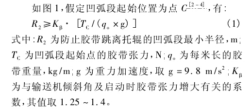 平穩(wěn)運(yùn)行。實(shí)際的設(shè)計(jì)計(jì)算表明,對(duì)于一般的皮帶輸送機(jī)凹弧段半徑的計(jì)算,式( 1) 的計(jì)算結(jié)果可滿足要求。但在某些條件下,式( 2) 、( 3) 的計(jì)算結(jié)果也會(huì)大于式( 1) 的所得,從而導(dǎo)致半徑過(guò)大給工藝布置帶來(lái)一定的困難。查式( 2) 、( 3) ,可采取加大拉緊力的方法以增大Tc值,使其計(jì)算結(jié)果得到減小。下面將討論凹弧段起始點(diǎn)張力Tc的計(jì)算方法。